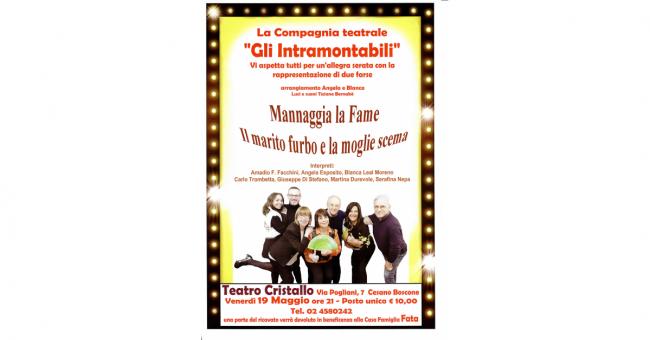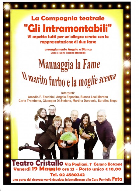 Ricordo che nella nostra Cesano Boscone (MI) abbiamo la fortuna di possedere una magnifica e ben qualificata sala teatrale: “Il Cinema Teatro Cristallo” dove il 19 maggio c.a. avremo l'occasione di assistere a due farse allestite dalla “Compagnia gli Intramontabili”. Compagnia composta in gran parte da Cesanesi appassionati di teatro, con varie esperienze teatrali e che intendono portare avanti il gusto della risata semplice ma tanto salutare. Ridere fa bene, proprio così! Perché assistere e fare teatro è un’attività divertente e appassionante.