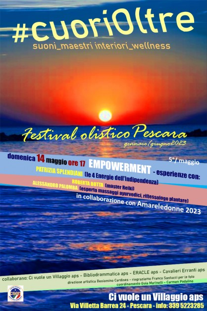 Domenica 14 maggio dalle 17 a Ci vuole un villaggio aps (Via Villetta Barrea 24 a Pescara) quinto appuntamento con il Festival olistico Pescara “#CuoriOltre – suoni, maestri interiori, wellness” che andrà avanti fino a giugno proponendo incontri esperienziali con le discipline del nuovo benessere. Evento organizzato in collaborazione con Ci vuole un Villaggio aps, Bibliodrammatica aps, Eracle aps, Cavalieri Erranti T.F. aps e con il patrocinio morale dello CSEN-Centro Sportivo Educativo Nazionale. Direzione artistica Beniamino Cardines, coordinamento Guia Marinelli e Carmen Padalino.