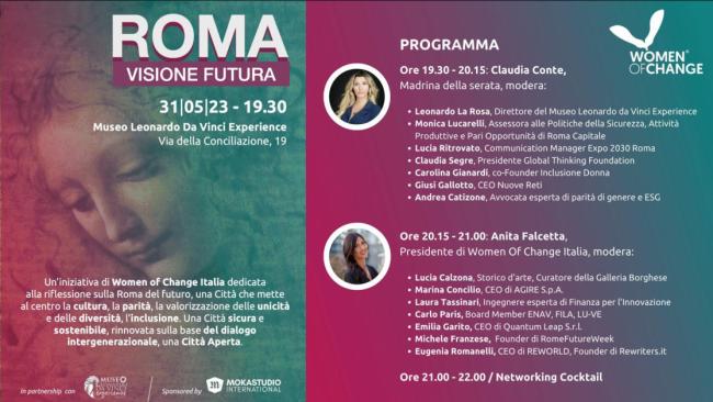 “Roma, Visione Futura” è il titolo della seconda data del ciclo di eventi nazionali dell’Associazione Women Of Change Italia dedicati alla riflessione sul tema del futuro delle città. La data romana si terrà mercoledì 31 maggio 2023 presso la suggestiva cornice del Museo Leonardo Da Vinci Experience, in via della Conciliazione 19, alle ore 19.30.