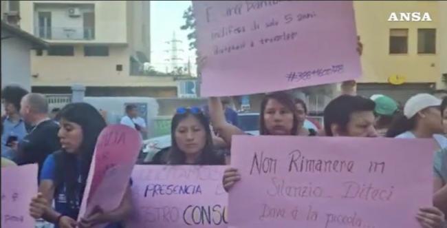"Sono passate 30 ore e ancora non abbiamo notizie della piccola Kata - affermano i manifestanti - Sollecitiamo l'intervento del consolato del Perù". (ANSA)