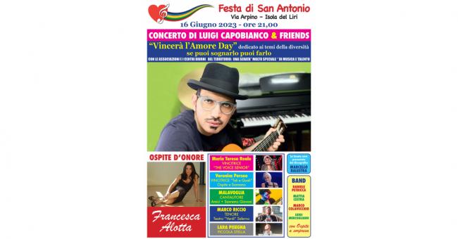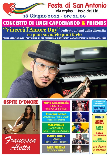 A Isola del Liri (FR) ci sarà il concerto “Luigi Capobianco and Friends” con la band I Club Mario, composta da Marco Colavecchio, Daniele Petricca, Luigi Mercogliano e Mattia Cestra. L’evento sarà presentato da Marcello Balestra e vedrà sul palco con Luigi, Maria Teresa Reale (vincitrice di The Voice Senior 2023) Veronica Perseo (vincitrice di Tali e Quali Show 2019), Gianluca Malavoglia cantautore, Marco Riccio tenore e Lara Pisegna la piccola nipote del cantautore che duetterà, come gli altri ospiti, con lui. Ospite d’Onore Francesca Alotta.