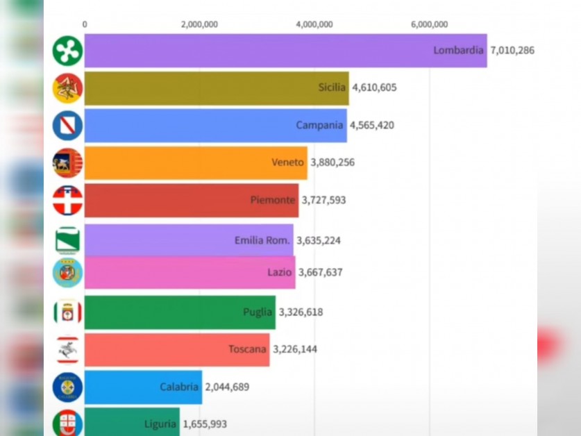 Questo grafico statistico è un ottima fotografia di come l'Italia si sia evoluta negli ultimi anni. Le regioni più piccole del sud perdono popolazione a seguito del boom economico avvenuto negli anni '50 e '60, quando le persone si trasferivano al nord in cerca di lavoro. Non a caso, la regione che rimane la più popolosa per 7 decenni è la Lombardia.