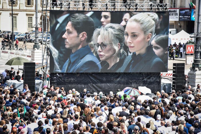 Nel frattempo, una quindicina di corone di fiori sono state lasciate sul sagrato davanti al Duomo. Oltre alla corona della premier Giorgia Meloni, sono state deposte anche quelle del gruppo Senato Forza Italia, una di Fratelli d'Italia e una del Partito socialista italiano composta da garofani rossi. Ci sono anche i fiori della senatrice azzurra Licia Ronzulli, del Comune di Roma, della Regione Abruzzo, dell'ambasciata di Israele e del consolato generale del Kuwait. La piazza è divisa a metà dalle transenne. Dietro al corridoio per la stampa si stanno raggruppando moltissimi curiosi, alcuni con la maglia del Milan e del Monza. Tre ragazzi hanno esposto uno striscione con scritto 'L'Italia è il Paese che amo', citazione dal discorso della discesa in campo di Berlusconi del 1994. La piazza inizia lentamente a riempirsi. Intorno alle 12:00, erano numerosi i tifosi del Milan. Presenti anche molti turisti, incuriositi dalla folla e dalle telecamere. Sono stati posizionati due maxischermi, alla sinistra e alla destra del Duomo.