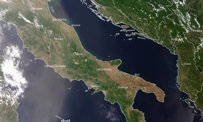 Questa immagine, acquisita da uno dei satelliti Copernicus Sentinel-3 il 20 giugno 2023, mostra i pennacchi di polvere sahariana che raggiungono l'Italia occidentale in concomitanza con la prima ondata di caldo estivo. La polvere interesserà gran parte della penisola, facendo apparire i cieli giallastri o lattiginosi.