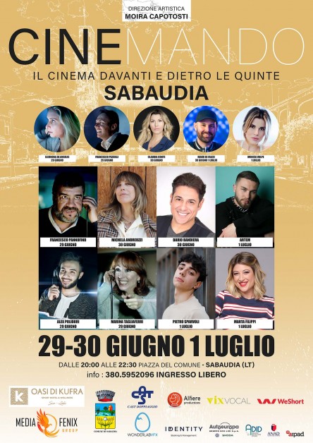 Il cinema davanti e dietro le quinte. Giovedì 29 giugno a Sabaudia prenderà il via la prima edizione di Cinemando, il festival dedicato alle maestranze del cinema, per una tre giorni dedicata al mondo segreto di chi dà vita e forma a film, serie, documentari e cartoni animati. L’evento, ideato e diretto da Moira Capotosti, supportata da Media Fenix Group, in collaborazione con Alfiere Productions, si svolgerà nella piazza del Comune.