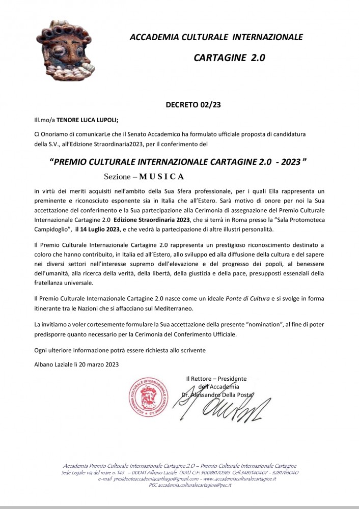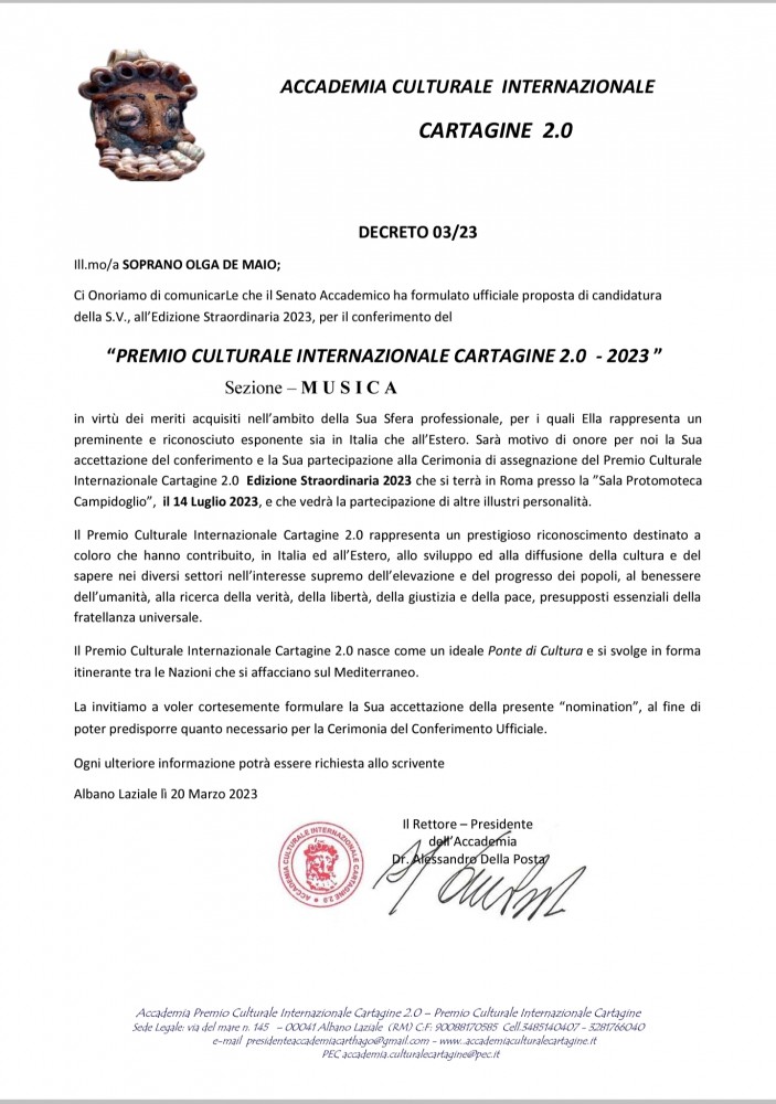 Un altro prestigioso ed illustre riconoscimento si aggiunge al palmarès per il soprano Olga De Maio ed il tenore Luca Lupoli, artisti lirici partenopei, candidati al ‘Premio Culturale Internazionale Cartagine 2.0 – 2023’ per la Sezione Musica.