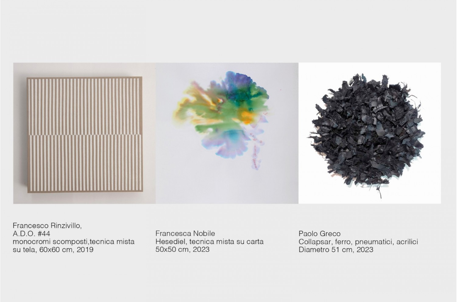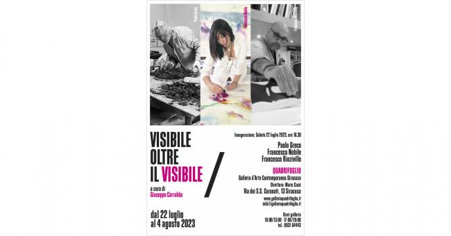 Lo spunto dalle naturali diversità delle tre esperienze artistiche ha dato modo a Giuseppe Carrubba, critico d’arte e curatore indipendente, di seguire la traccia del segno che attraversa le varie forme oltre la superficie. In questa indagine nasce quel visibile che si apre a nuovi livelli percettivi, secondo dinamiche contemporanee dettate dai binomi assenza-presenza, occultamento-rivelazione. Carrubba di fatto specifica: «Paolo Greco, Francesca Nobile e Francesco Rinzivillo, in Visibile oltre il visibile, mettono in campo aspetti relazionali e simbolici differenti, generano livelli di percezione in continua evoluzione, per indagare quell’aspetto liminare, qualcosa che emerge dalla condizione intermedia tra la luce ed il buio, l’immagine e l’astrazione, l’impronta o la sua ombra, l’indizio e la sparizione, il vuoto e l’infinito».