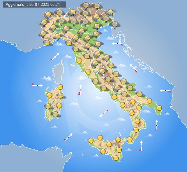 Sud e Isole: Al mattino tempo stabile con cieli sereni o poco nuvolosi. Al pomeriggio nuvolosità in aumento sui settori interni peninsulari ma senza fenomeni di rilievo associati, sole prevalente altrove. In serata si rinnovano condizioni di tempo stabile con nuvolosità e schiarite. Temperature minime e massime stabili o in lieve rialzo. Venti deboli o moderati dai quadranti nord-occidentali. Mari poco mossi o mossi. Valori massimi attesi tra i 34°C di Potenza e i 40°C di Bari