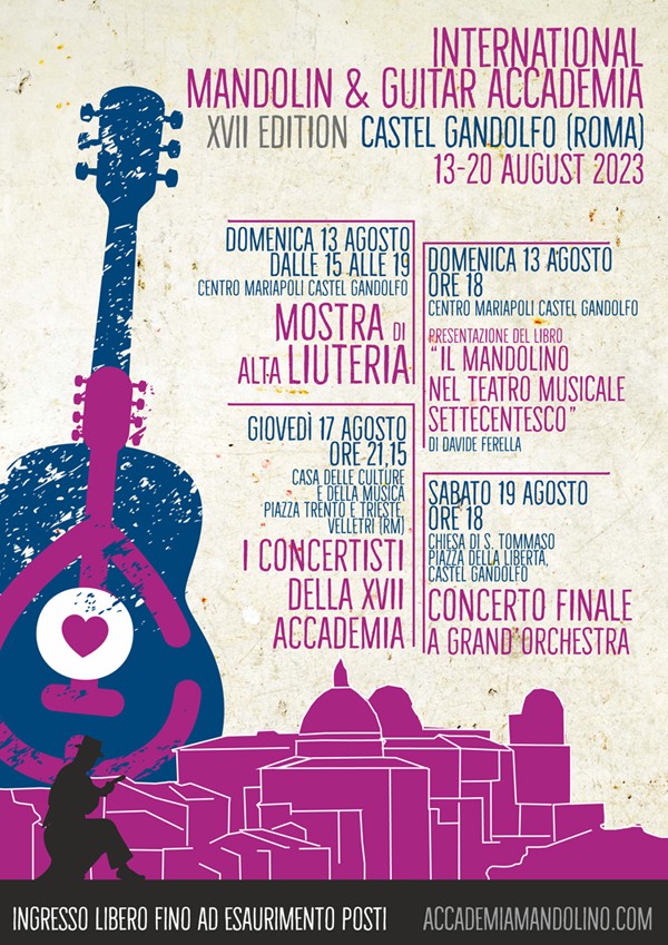 La XVII edizione estiva dell’Accademia avrà luogo in uno dei borghi più belli dalla nostra penisola: Castel Gandolfo in provincia di Roma in un territorio che offre molte opportunità all’insegna della natura, dell’arte, della storia e dell’enogastronomia. Presso il Centro Mariapoli Internazionale si svolgeranno le attività del campus estivo di perfezionamento, il direttore Aonzo verrà affiancato da considerevoli docenti concertisti: l’inimitabile interprete del mandolino napoletano Michele De Martino, il Maestro italo-francese di esperienza internazionale Fabio Gallucci, Il paganiniano Riccardo Del Prete e l’esperto didatta di chitarra flamenca Roberto Margaritella.