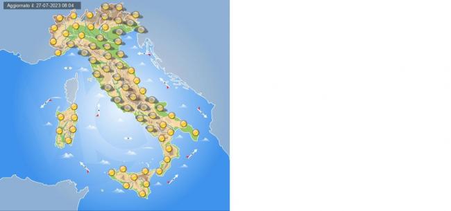 Al Nord: Al mattino nubi in transito ovunque ma senza piogge. Al pomeriggio piogge o temporali sparsi sulle Alpi, asciutto altrove. In serata tempo instabile sulle Alpi con fenomeni in movimento dai rilievi verso le pianure. Temperature minime e massime in rialzo. Venti deboli o moderati dai quadranti sud-orientali. Mari poco mossi o mossi. Valori massimi fino a 29 gradi a Milano, 27 a Torino.
