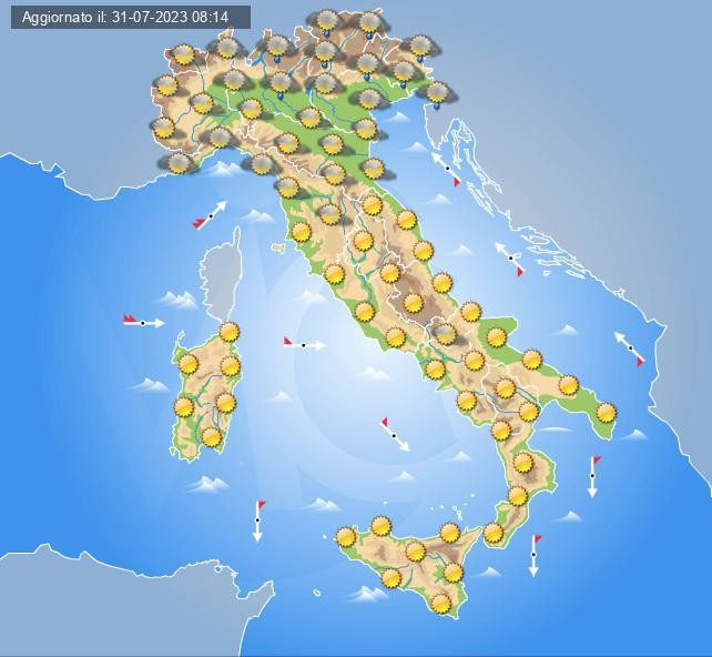 Al Nord: Al mattino nuvolosità irregolare, piogge e acquazzoni sparsi. Al pomeriggio fenomeni soprattutto in montagna, asciutto altrove. In serata tempo stabile salvo residue piogge sulle Alpi. Temperature minime e massime stabili o in calo. Venti deboli o moderati di direzione variabile. Mari poco mossi o localmente mossi. Valori massimi fino a 31 gradi a Milano, 30 a Torino, 33 a Bologna.
