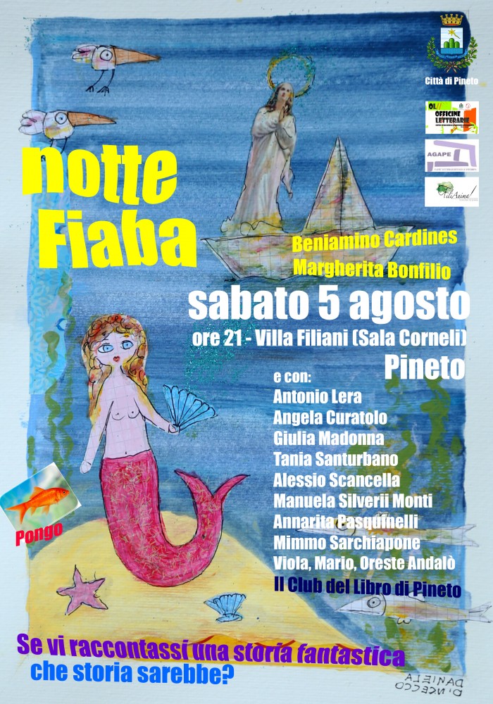 Sabato 6 agosto 2023 dalle ore 21:00 nella splendida Sala Corneli di Villa Filiani a Pineto si terrà “Notte Fiaba – scrittura per le emozioni” a cura di Beniamino Cardines e Margherita Bonfilio. In collaborazione con il Comune di Pineto e l’Assessorato alla Cultura, la Pro Loco e il Club del Libro di Pineto, i Caffè Letterari d’Italia e d’Europa, OL/Officine Letterarie Pescara.