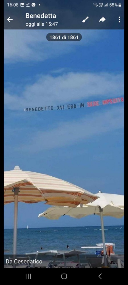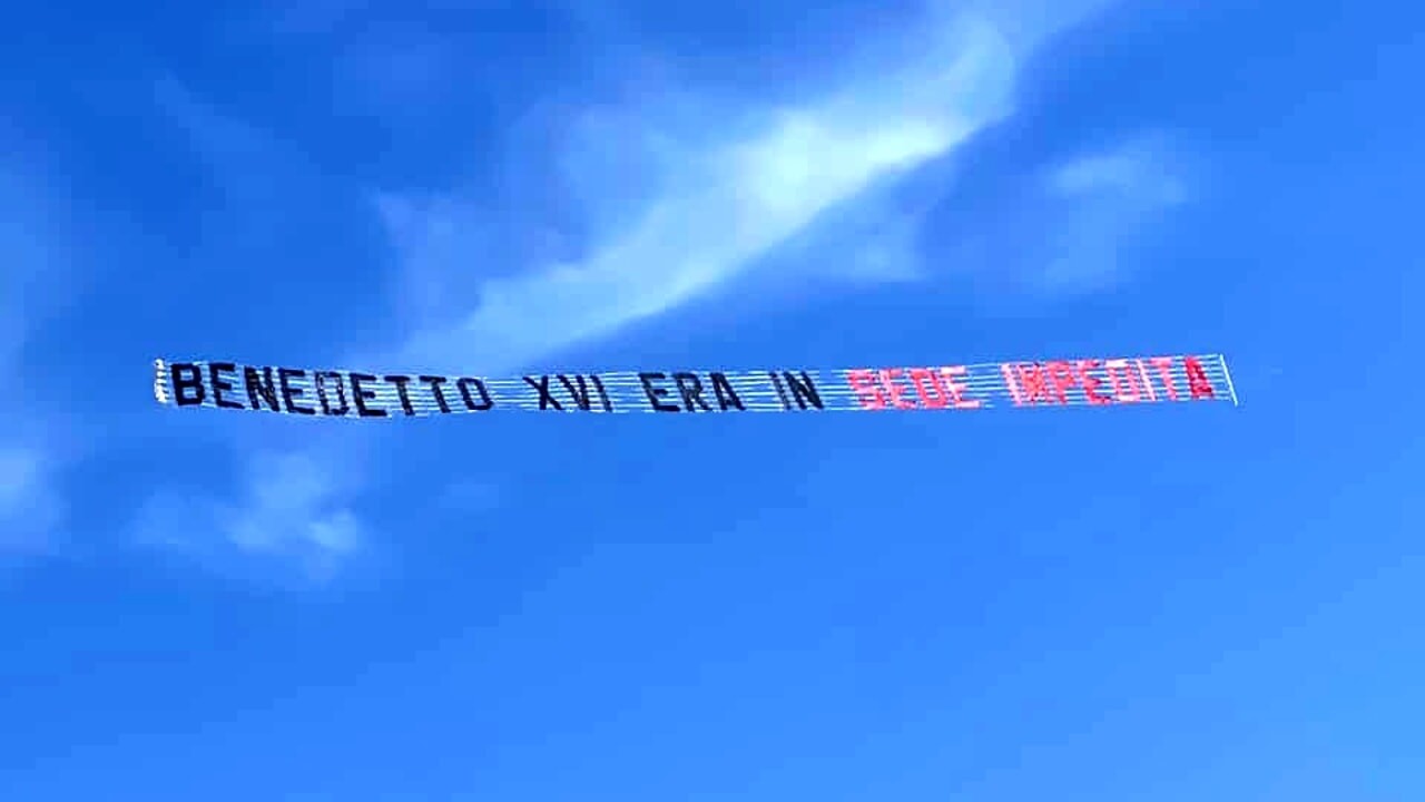 Nella mattinata di ieri domenica 27 agosto, nei cieli del litorale veneto-romagnolo da Caorle a Fano, è passato un aereo con uno striscione dalla scritta cubitale inequivocabile: BENEDETTO XVI ERA IN SEDE IMPEDITA.