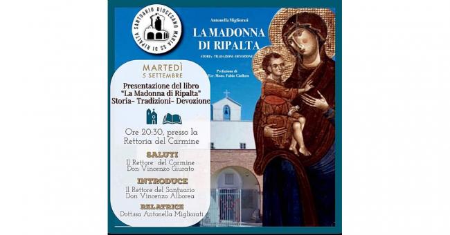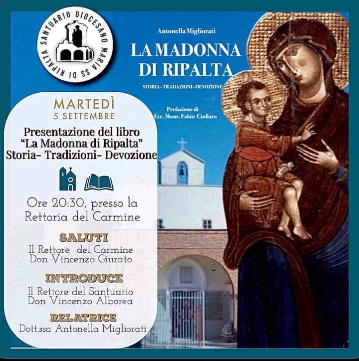 Cerignola (FG) - Martedì 5 settembre 2023 alle ore 20,30, nella Rettoria del Carmine a Cerignola, si terrà la presentazione del libro "La Madonna di Ripalta. Storia, tradizioni, devozione" di Antonella Migliorati (Youcanprint, 2023, pp. 552). Dialogheranno con l'autrice il rettore del Carmine don Vincenzo Giurato e il rettore del Santuario don Vincenzo Alborea.