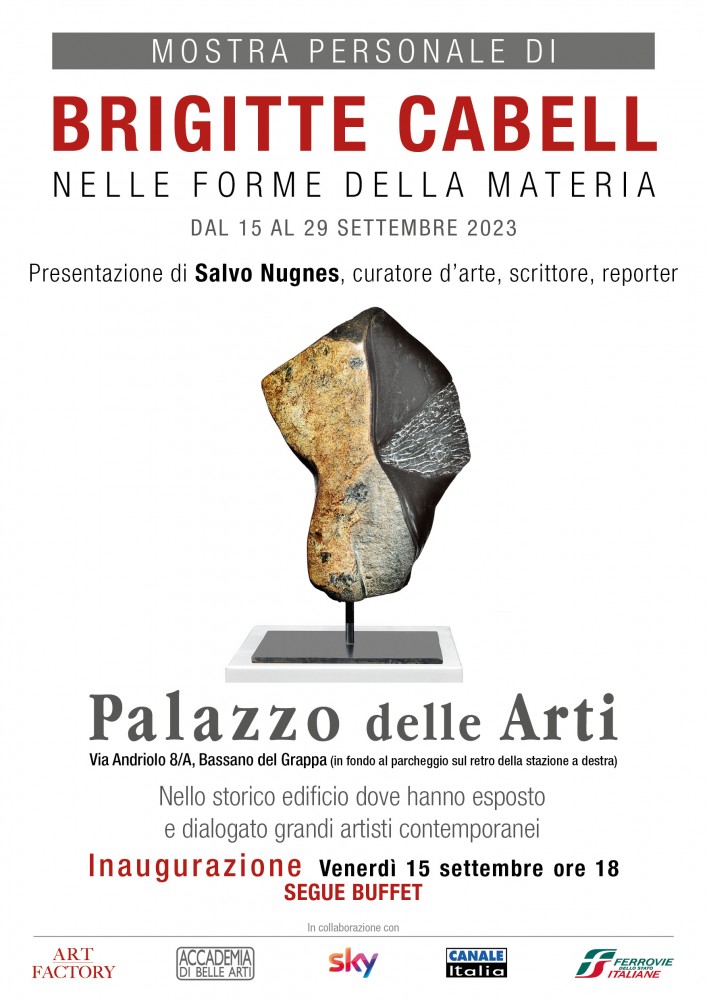 Dal 15 al 29 settembre lo storico Palazzo delle Arti di Bassano del Grappa, centro polivalente con sala convegni, sala musica, biblioteca, spazi espositivi, palestra ed altro in un edificio del 1910 con fregi dell’epoca, esporrà le splendide sculture di Brigitte Cabell, in una mostra personale curata dal critico d’arte Salvo Nugnes, curatore delle mostre del Festival di Spoleto, Biennale di Venezia, Biennale Milano e già manager di personalità dell’arte e della cultura come Sgarbi, Alberoni, Ricciarelli, Margherita Hack e altri ancora.