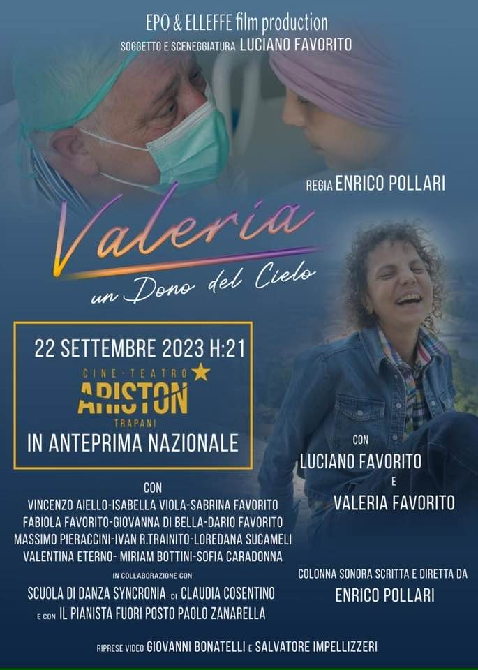 Ci racconta Massimo Pieraccini.....Sono già uscite le locandine che annunciano la prima nazionale di un docufilm, al Cinema Teatro Ariston, "??????? ?? ???? ??? ?????", che vede come protagonista principale Valeria Favorito, una ragazza nata ad Erice che all’età di 11anni si è ammalata di leucemia mieloide acuta, salvata grazie alla donazione del midollo osseo di Fabrizio Frizzi. Non a caso, le riprese sono state fatte proprio tra Trapani - città originaria della famiglia Favorito - e Verona. Tutto parte da un incontro tra il padre di Valeria, Luciano Favorito ed Enrico Pollari, noto fotografo trapanese che è stato anche regista e produttori di altre pellicole molto apprezzate dalla critica.