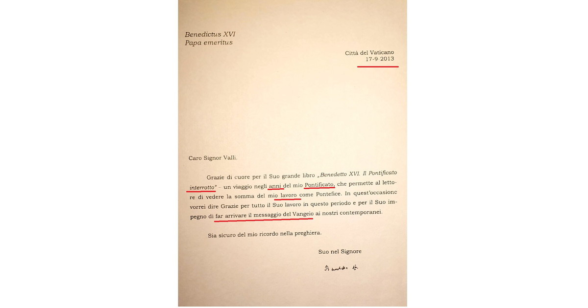 Esattamente 10 anni fa, il 17 settembre 2013, nel giorno (casuale?) di San Roberto Bellarmino, cardinale teologo che affermava l’automatico decadimento di un papa eretico, Benedetto XVI scrisse a Valli una cortese lettera in merito al suo libro, pubblicato nel marzo 2013, intitolato “Benedetto XVI. Il Pontificato interrotto” (Mondadori 2013):