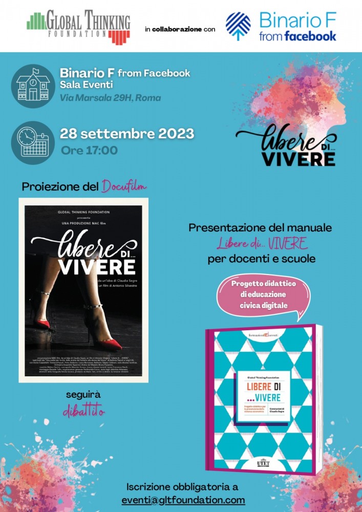 Nasce il manuale “Libere di… VIVERE”, realizzato nell’ambito dell’omonimo progetto della Global Thinking Foundation presieduta da Claudia Segre, che verrà presentato Giovedì 28 settembre alle ore 17 presso il Binario F from Facebook nella stazione Termini di Roma (via Marsala 29h) con ingresso gratuito (iscrizione obbligatoria a eventi@gltfoundation.com).