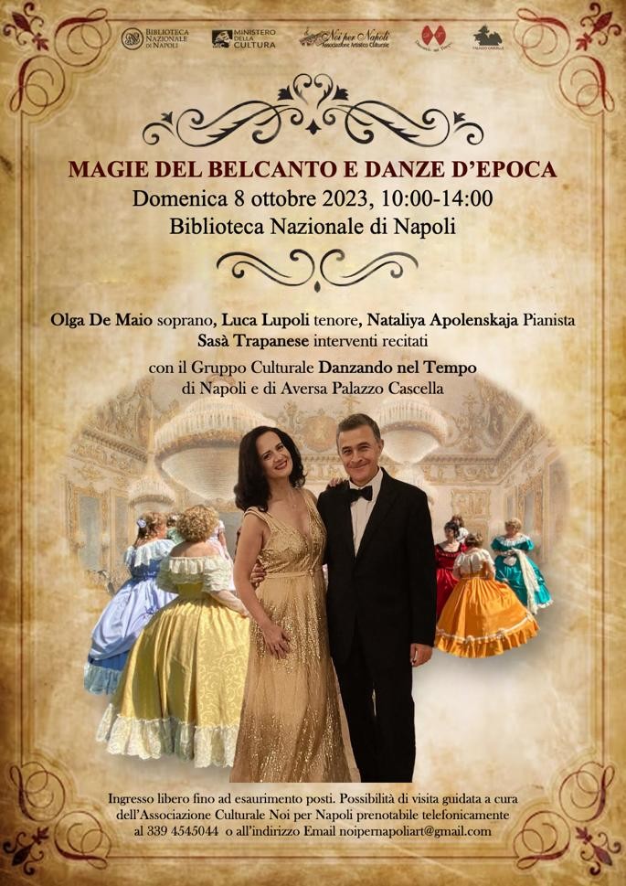 Dopo la visita guidata alla mostra allestita nelle sale della Lucchesi Palli, il soprano Olga De Maio ed il tenore Luca Lupoli , in concerto accompagnati al pianoforte da Nataliya Apolenskaja, faranno rivivere la magia delle più note arie del repertorio di carusiano , interventi recitati dell’attore Sasà Trapanese.