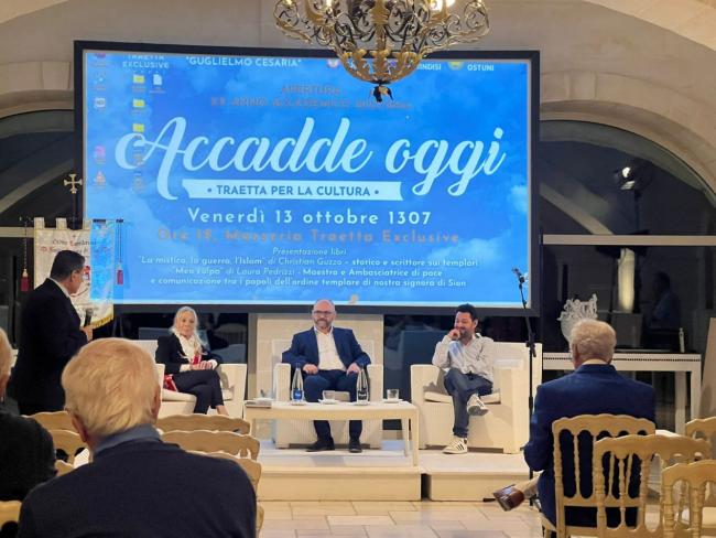 I Cavalieri Templari. Un argomento che da sempre affascina grandi e piccini. La storia dei monaci guerrieri dal bianco mantello e con la croce patente rossa cucita sui loro abiti evocano da sempre storia e leggenda al tempo stesso. Chi conosce anche in maniera superficiale la storia dei Cavalieri del Tempio, o Templari, appunto, saprà che essi vennero arrestati in tutta la Francia il 13 ottobre del 1307. Da quel giorno la data venerdì 13 venne conosciuta come giorno nefasto, almeno nel “Vecchio Continente”. A ricordare i Templari ci ha pensato nella serata del 13 ottobre 2023 , a 716 anni dall'arresto dei cavalieri, l'Università Popolare di Carovigno, che ha organizzato un convegno a tema con illustri relatori. Presenti all'evento c'erano i relatori Federico Sanapo, già conosciuto a Brindisi per i suoi studi sulla chiesa di San Giovanni al Sepolcro in Brindisi; Christian Guzzo, esperto di storia dei Templari, saggista, che ha presentato il suo ultimo libro “I Templari: la Mistica, l'Islam, la Guerra” e Laura Pedrizzi, Maestra e Ambasciatrice di Pace e Comunicazione tra i Popoli dell'Ordine Templare di Nostra Signora di Sion. I relatori sono stati introdotti da Luigi Cesaria, Rettore dell'Università Popolare di Carovigno e da Adriana Valente, professoressa di filosofia e storia. Ad intervenire in apertura anche Giuseppe Primicerio, direttore di Masseria Traetta Exclusie.
