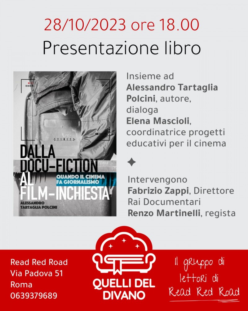 Sabato 28 ottobre 2023, alle ore 18:00, presso la libreria Read Red Road, in via Padova 51 – Roma, si terrà la presentazione del libro di Alessandro Tartaglia Polcini“Dalla docu-fiction al film-inchiesta” - Quando il cinema fa giornalismo. L’autore dialogherà con la critica cinematografica Elena Mascioli. Intervengono al dibattito Fabrizio Zappi, RAI Documentari, e Renzo Martinelli, regista.