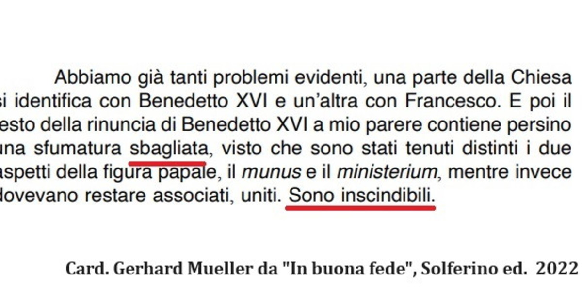 Con quella sua breve dichiarazione in latino, papa Ratzinger, l’11 Febbraio 2013 non abdicò minimamente, come ci è stato ammannito dal mainstream, ma non fece altro che “profetizzare” la sua prossima sede impedita, causata da un conclave illegittimo, convocato a Papa non morto e non abdicatario. Solo in questo modo si spiega in modo coerente la sua altrimenti assurda rinuncia al solo ministerium (il potere di fare il Papa) con il trattenimento del munus, l’investitura di Pontefice, di origine divina, (l’essere Papa). Ricorda il card. Gerhard Müller nel suo ultimo libro “In buona fede”, infatti, che munus e ministerium “sono inscindibili”.