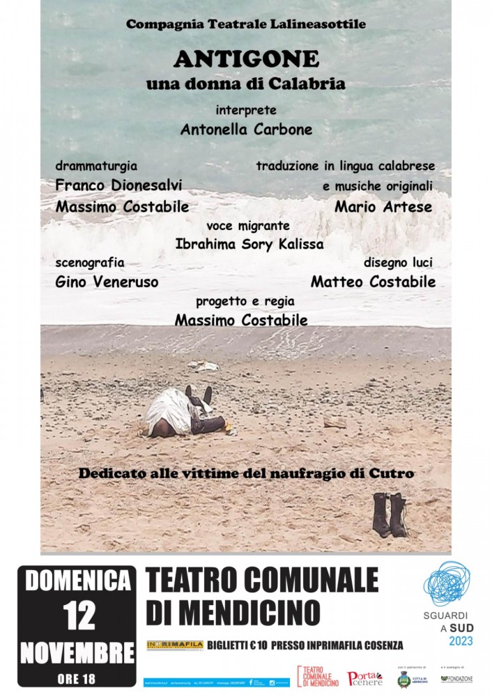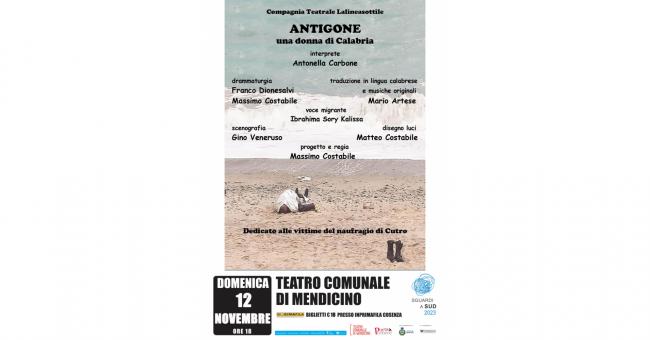 La rassegna di teatro contemporaneo "Sguardi a Sud", sapientemente curata dalla compagnia Porta Cenere, è pronta a catturare il cuore del pubblico con un nuovo e imperdibile appuntamento. Il palcoscenico, sotto la direzione artistica di Mario Massaro, con il patrocinio del Comune di Mendicino e il sostegno della Fondazione Carical, prenderà vita con "Antigone - una donna di Calabria". Lo spettacolo, in scena il 12 novembre (ore 18) presso il Teatro comunale di Mendicino, è un toccante omaggio alle vittime del naufragio di Cutro. Una storia che si intreccia con la drammaturgia firmata da Franco Dionesalvi e Massimo Costabile, l'interpretazione di Antonella Carbone, la traduzione in lingua calabrese e le musiche originali curate da Mario Artese, la scenografia di Gino Veneruso, il disegno luci di Matteo Costabile e il progetto regia di Massimo Costabile.