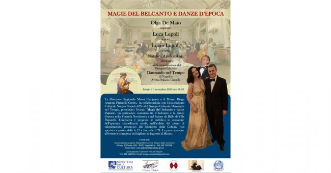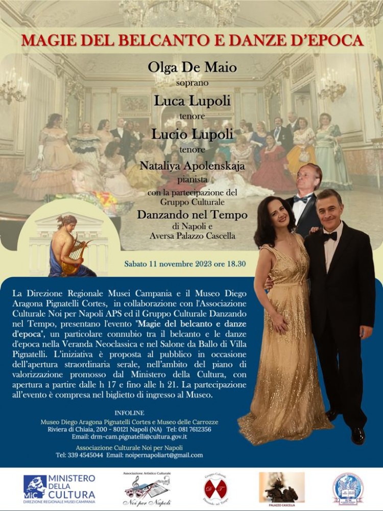 Sabato 11 novembre 2023 alle h.18.30,presso il Museo Diego Aragona Pignatelli Cortes, in collaborazione con l'Associazione Culturale Noi per Napoli APS ed il Gruppo Culturale “Danzando nel Tempo” di Napoli e di Aversa Palazzo Cascella, avrà luogo l'evento "Magie del belcanto e danze d'epoca", un particolare connubio tra il belcanto e le danze d'epoca nella Veranda neoclassica e nel Salone da ballo di Villa Pignatelli.