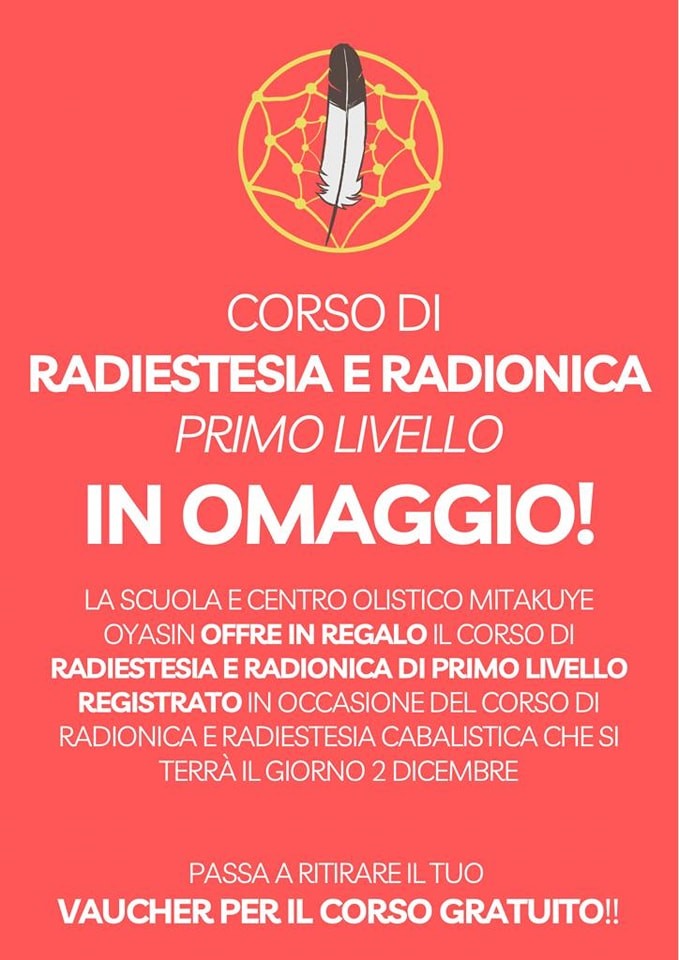 In occasione del Natale ormai alle porte, grazie al progetto Oriente e Benessere Accademia delle Arti Centro Studio Olistico di Natascia e Romina Malizia, è arrivata sul territorio la Scuola Olistica Mitakuye Oyasin. Il Direttore della scuola Emiliano Amici in accordo con Natascia e Romina, ha deciso di promuovere le proprie attività e la diffusione della conoscenza legata alla Radionica e la Radiestesia, omaggiando tutti coloro che passeranno a trovarli durante il Corso di Radionica e Radiestesia Cabalistica di I° livello, sabato 2 dicembre.