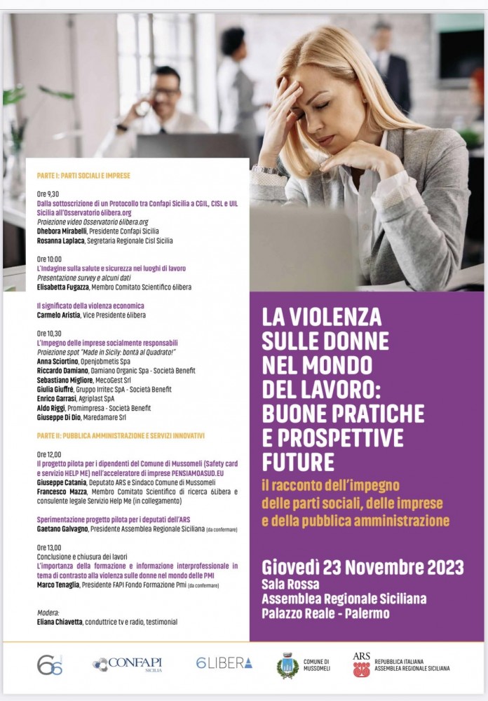 Gravano fino al 3,5% sul Pil nazionale, ma ancora si fa troppo poco, Imprese, Pubblica Amministrazione e Parti Sociali a confronto per contrastare molestie e violenze sul lavoro il 23 novembre 2023 a Palermo, all’Ars, sala rossa a partire dalle 9.30, tema che sarà affrontato durante il convegno “La violenza sulle donne nel mondo del lavoro: buone pratiche e prospettive future”. L’Associazione 6come6,6libera ha istituito il 21 giugno 2021 il primo Osservatorio Digitale Europeo contro le molestie e violenze sul lavoro su impulso della Confederazione italiana per la piccola e media industriale siciliana (Confapi Sicilia).
