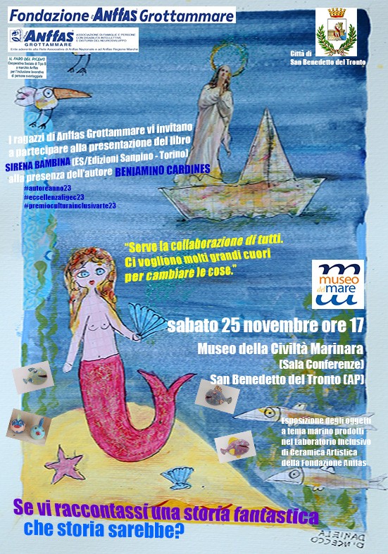Gabriella Ceneri, presidente Fondazione Anffas Grottammare (AP): “Il racconto viene proposto al lettore con un linguaggio semplificato, parla della diversità in termini inclusivi, con molti dialoghi. Per questo ne abbiamo proposto la lettura ai nostri ragazzi, che sono rimasti entusiasti. Ho pensato quindi, insieme alla Presidente Maria Lauri, di organizzarne la presentazione, per condividere con il territorio l’impegno per l’inclusione sociale dei nostri ragazzi. Alcuni di loro, nell’occasione della presentazione, saranno coinvolti nella lettura animata. Abbiamo scelto la location del Museo del Mare, per l’affinità con la storia di Sirena Bambina e perché rappresenta un luogo amato dai bambini per i diversi eventi che vi vengono organizzati. Con l’occasione allestiremo un’esposizione di oggetti a tema marino, tra i quali i nostri famosi pesci e qualche sirena, realizzati nel nostro Laboratorio Inclusivo di Ceramica.”