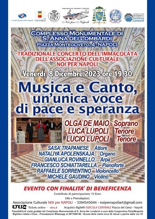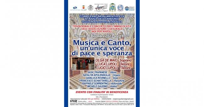 Il Tradizionale Concerto dell' Immacolata 2023 che avrà luogo l' 8 dicembre 2023 come apertura tradizionale ed ufficiale delle festività natalizie,presso lo storico Complesso Monumentale di Sant’Anna dei Lombardi,in Via Monteoliveto n.4 a Napoli alle h.19,30, avrà come titolo Musica e Canto in un' unica voce di Pace e Speranza.