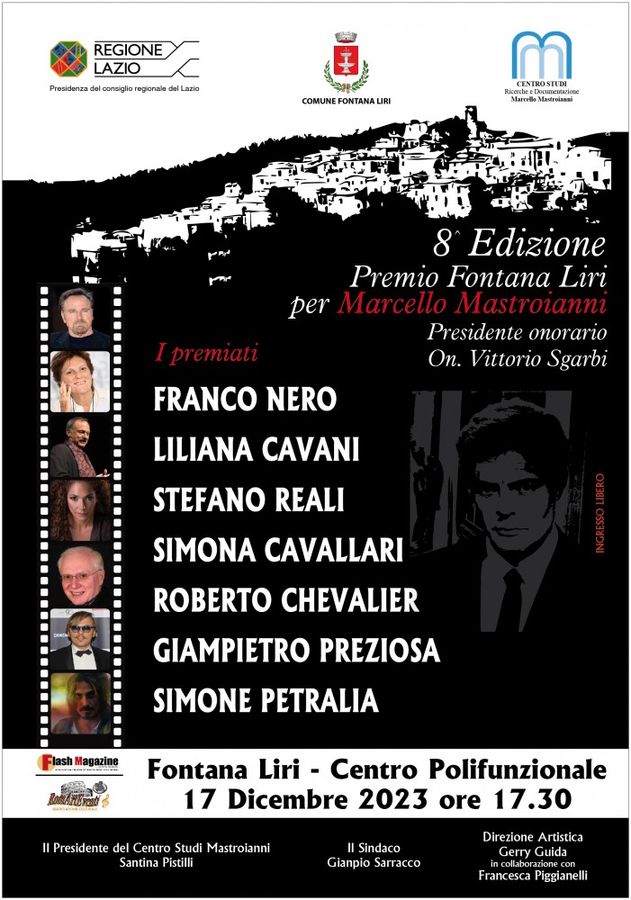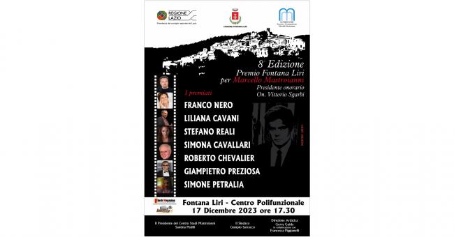 Si terrà il 17 dicembre 2023 alle ore 17:30 a Fontana Liri, paese natale del celebre attore, presso il Centro Polifunzionale, la cerimonia di premiazione dell’ottava Edizione del Premio Fontana Liri per Marcello Mastroianni voluto fortemente dall’Amministrazione Comunale nella persona del Sindaco Gianpio Sarracco con la preziosa collaborazione del Centro Studi Ricerche e Documentazione Marcello Mastroianni diretto da Santina Pistilli.