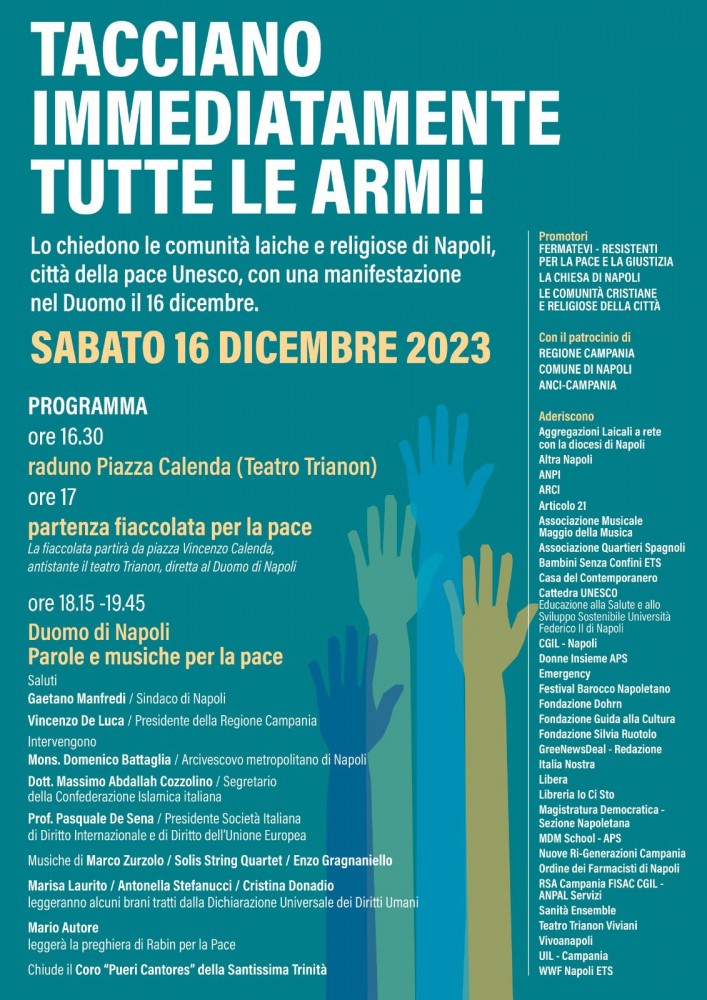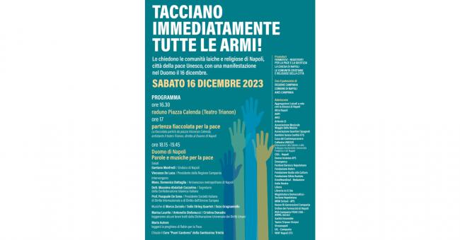 Una partecipazione corale che prenderà il via con una fiaccolata di bambini che partirà dallo storico teatro Trianon per raccogliersi nell’antichissima cattedrale di Santa Maria dell'Assunzione, che aprirà le sue porte in nome della pace, Parleranno Mons. Domenico Battaglia, arcivescovo di Napoli, il Dott. Massimo Abdallah Cozzolino, Segretario della Confederazione Islamica Italiana, il Prof. Pasquale De Sena, Presidente della Società Italiana di Diritto Internazionale e di Diritto dell’Unione Europea. Il sindaco di Napoli Gaetano Manfredi e il Presidente della Regione Campania Vincenzo De Luca porteranno i saluti istituzionali.