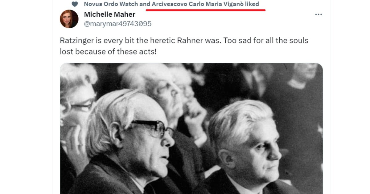 Possiamo inoltre ricordare come Viganò abbia pubblicamente approvato un post Twitter in cui si sostiene che Ratzinger era eretico tanto quanto Rahner e sullo stesso social ha sentenziato: “Siamo governati da apostati, e questo dura dai tempi del Concilio”. Quindi anche Benedetto XVI era un apostata, deduciamo.