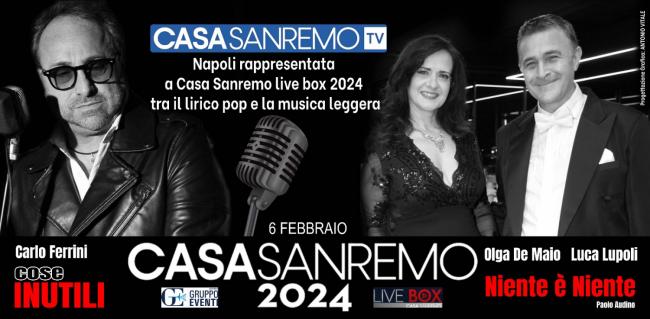 Gli artisti lirici Olga De Maio soprano,il tenore Luca Lupoli ed il cantautore Carlo Ferrini, artisti partenopei doc, saranno protagonisti della Kermesse sanremese, parallela al 74° Festival della Canzone Italiana, al Palafiori di Sanremo il 6 febbraio per Casa Sanremo Live box 2024, con esibizione live streaming sul canale TV di Casa Sanremo!
