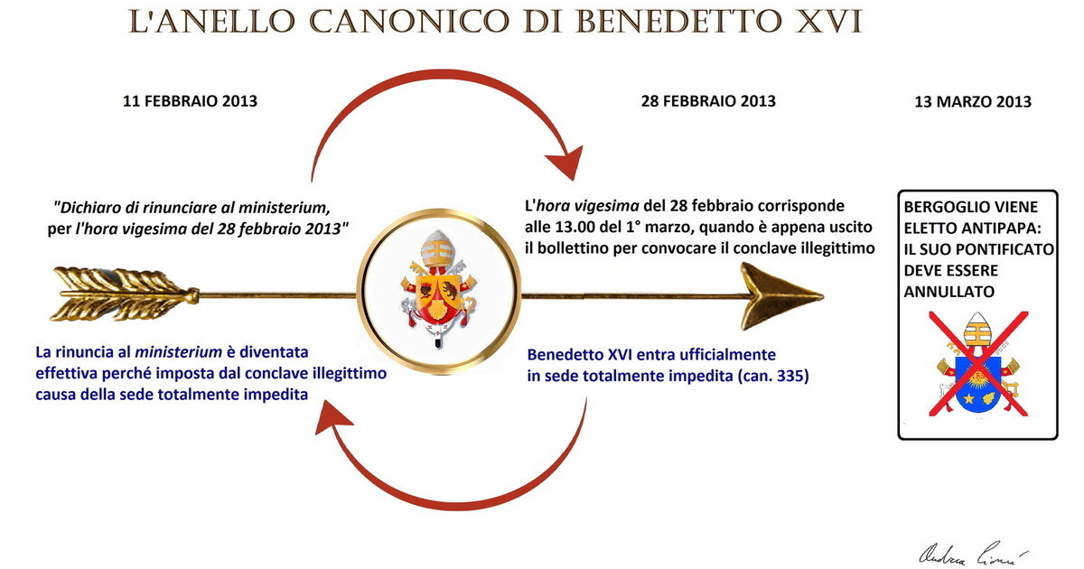 Siamo giunti a tale conclusione esclusivamente per metodo logico-induttivo e analizzando gli scritti di papa Benedetto in tipica “restrizione mentale larga” (vulgo “codice Ratzinger”): uno stile comunicativo tratto dalla teologia morale che consente di dire la verità in modo logicamente sottile, affinché solo chi ha orecchie per intendere possa capire.