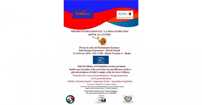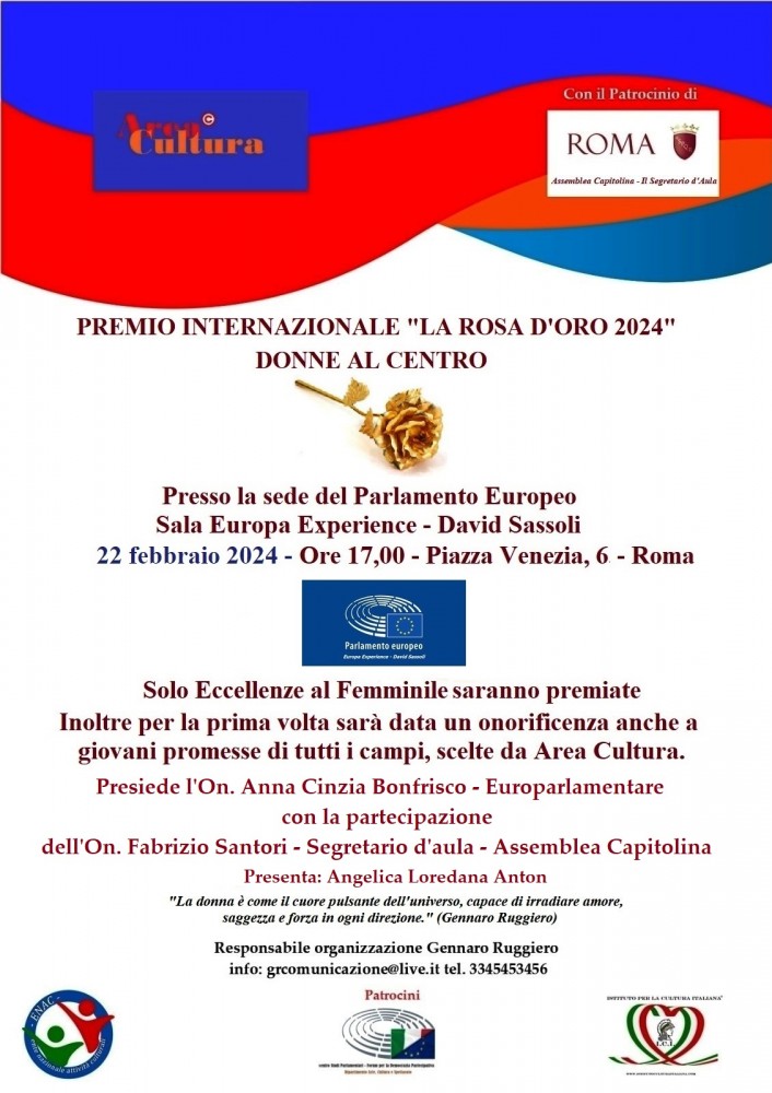 Il prossimo 22 febbraio dalle ore 17,00, l’associazione Area Cultura terrà la cerimonia di premiazione, al Parlamento Europeo – Sala David Sassoli”, del Premio Internazionale "La Rosa d'Oro - Donne al Centro"