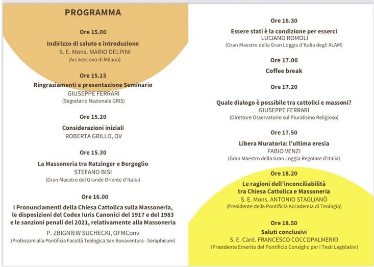 La notizia del seminario a invito “Chiesa cattolica e Massoneria”, che sarà ospitato dalla Fondazione Ambrosianeum venerdì 16 febbraio, è circolata sui social e sulla stampa nazionale (articoli sono stati dedicati da Il Messaggero e Il Fatto Quotidiano) negli ultimi giorni e soprattutto ieri. «Questo Seminario - si legge nella presentazione dell’evento - si propone di far conoscere il pensiero di due realtà, Chiesa Cattolica e Massoneria, che sono state spesso in conflitto tra loro e su posizioni morali, spirituali e sociali non condivise». Il pensiero della Massoneria sarà illustrato dai Gran Maestri delle tre obbedienze italiane maggiori: il Grande Oriente d’Italia, la Gran Loggia d’Italia degli Antichi Liberi Accettati Muratori e la Gran Loggia Regolare d’Italia. Il Gran Maestro del Grande Oriente d’Italia Bisi interverrà sul tema “La Massoneria tra Ratzinger e Bergoglio”, il Gran Maestro della Gran Loggia d’Italia degli Antichi Liberi Accettati Muratori Romoli interverrà sul tema “Essere stati è la condizione per esserci” e il Gran Maestro della Gran Loggia Regolare d’Italia Venzi interverrà sul tema “Libera Muratoria: l’ultima eresia”.