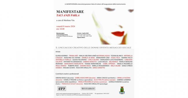 In occasione della Giornata internazionale della Donna, venerdì 8 marzo, la galleria Montevergine artecontemporanea organizza "MANIFESTA/re Taci anzi parla", un'iniziativa a cura di Marilena Vita che si propone di esaltare il linguaggio creativo delle donne come veicolo per trasmettere un messaggio sociale potente e attuale. La manifestazione è organizzata con il patrocinio dell'Assessorato alla Cultura del Comune di Siracusa. Tre i momenti dell'iniziativa.