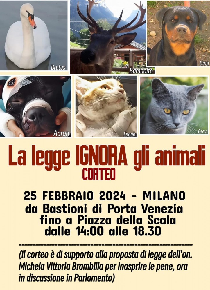 “La #legge IGNORA gli #animali”: è questo il titolo della manifestazione indetta domenica 25 febbraio a Milano per chiedere pene più severe per chi maltratta, abbandona e uccide.