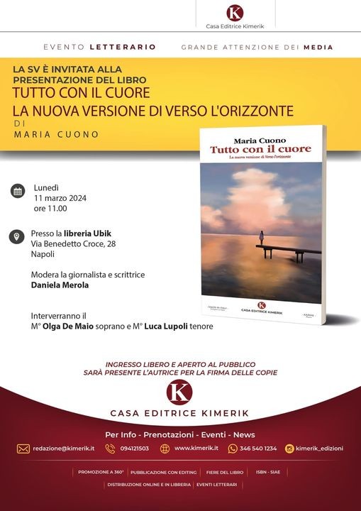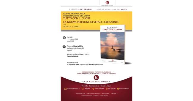 Lunedì 11 marzo alle ore 11.00 si terrà presso la libreria UBIK di Napoli la presentazione del nuovo libro della giornalista e scrittrice Maria Cuono, dal titolo Tutto con il cuore. La nuova versione di Verso l’Orizzonte, edito a gennaio 2024 dalla Casa Editrice Kimerik. Modera la giornalista e scrittrice Merola Daniela. Interverranno il M° Luca Lupoli (tenore) e il M° Olga De Maio (soprano) che ha impreziosito con la prefazione l’ultima opera di Maria Cuono.