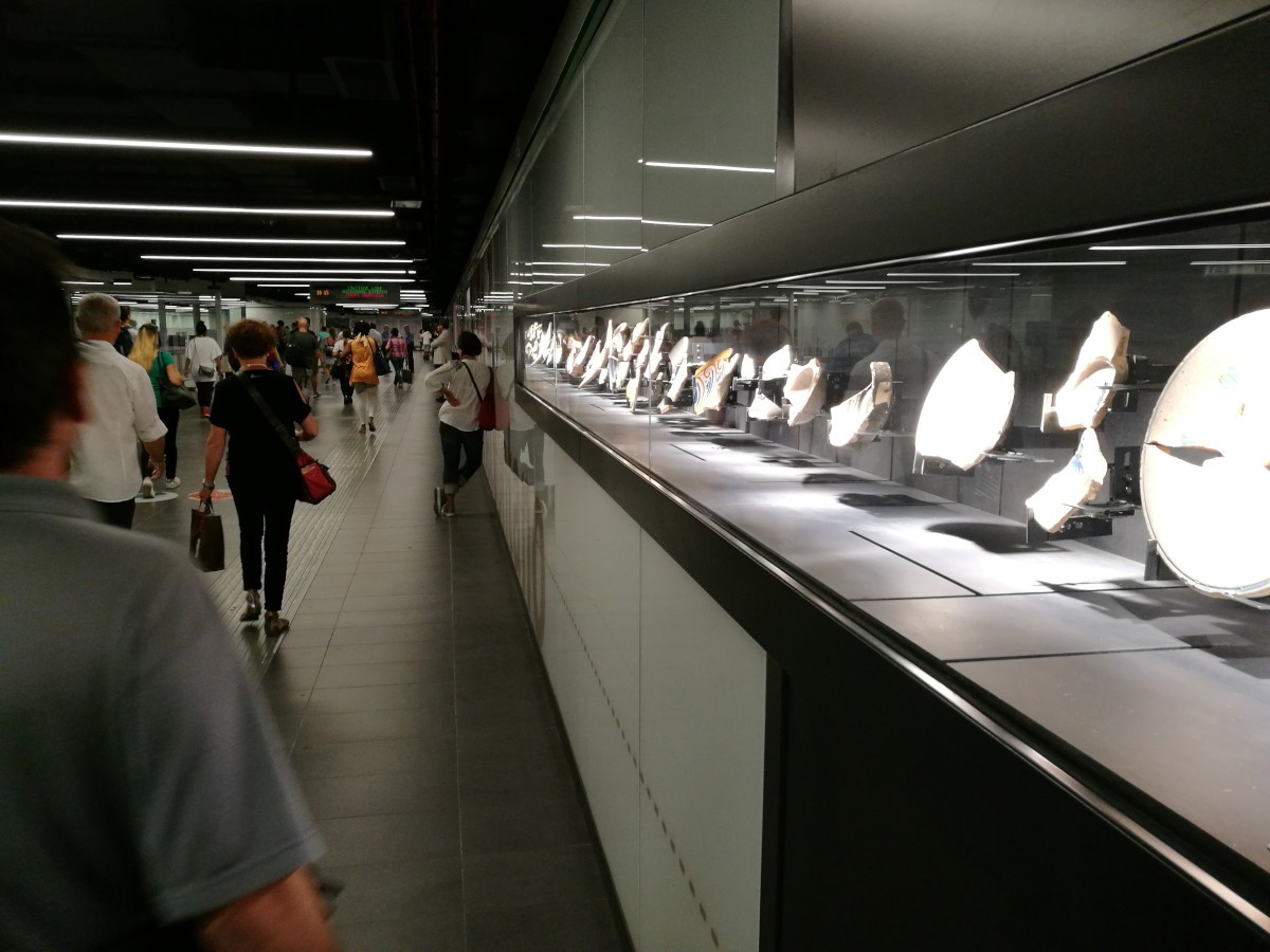 La seconda voce narrante è quella delle immagini. Alcune delle tracce materiali frutto della vita che per millenni è fluita in questi luoghi, recuperate durante la costruzione della stazione, sono diventate figure iconiche rappresentative del loro tempo e compaiono, restituite attraverso un processo di graficizzazione fuori scala, come segni identificativi delle diverse fasi.