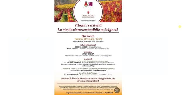 “Un incontro quanto mai attuale ed importante – sottolinea il presidente di Città del Vino, Angelo Radica -, dedicato ai cosiddetti vitigni Piwi, ovvero quei vitigni che hanno un'elevata resistenza alle malattie fungine e consentono una significativa riduzione dell'uso di pesticidi, un tema molto importante per i territori delle Città del Vino”.