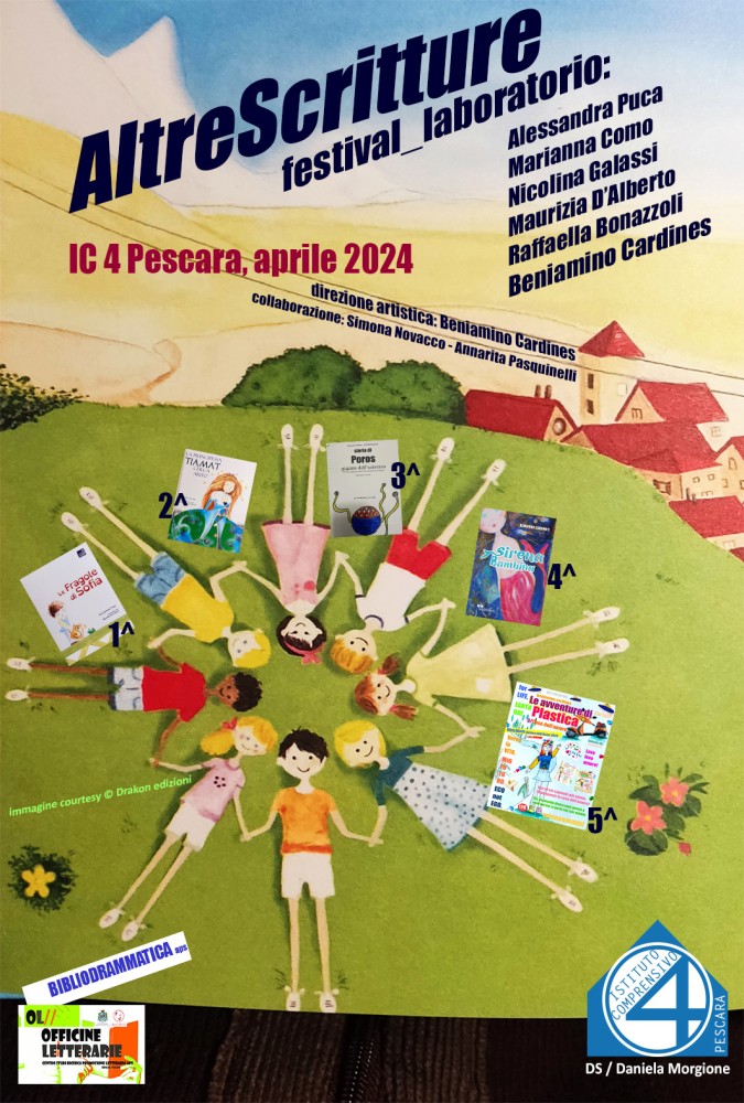 Pescara, dal 5 al 19 aprile presso l’Istituto Comprensivo Pescara 4, diretto dalla dott.ssa Daniela Morgione, si terrà “AltreScritture – festival laboratorio”. Abbiamo immaginato una programmazione letteraria che si propone come festival laboratorio: ovvero laboratori-esperienze creative con Autori e Autrici portatori di valori coscienziali. Pensiamo alla Letteratura come possibilità di coinvolgere e sensibilizzare i bambini e i ragazzi – in questo caso della Primaria – dentro una riflessione sociale partendo dal loro sguardo e punto di vista.