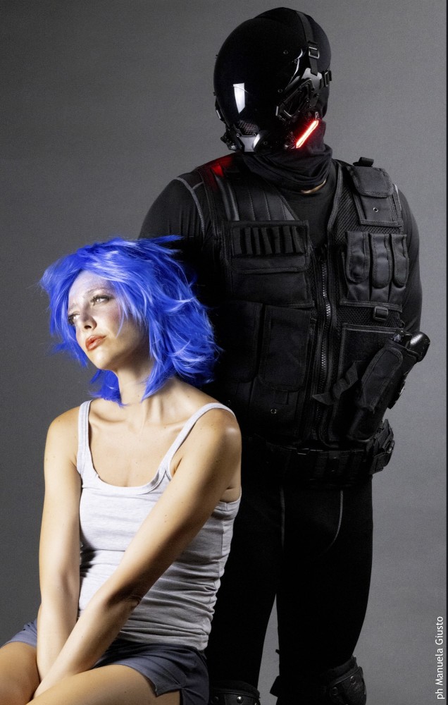 Da una parte megafono con slogan di rivolta e dall’altra manganello e scudo, l’indifferenza che incontra l’odio, una società in frantumi, terrorismo e tradimento e un avatar della realtà virtuale protagonista della società consumistica. In un futuro privo di emozioni reali che posto ha l’amore?
