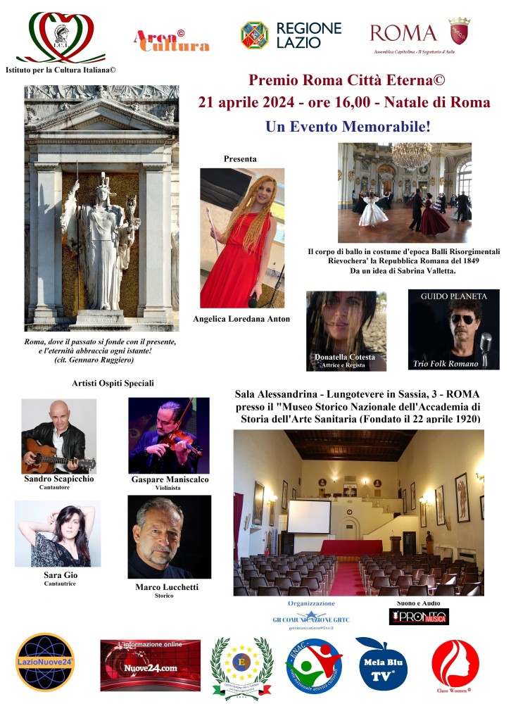 Il "Premio Roma Città Eterna", è un'occasione straordinaria e unica dedicata a celebrare il Natale di Roma, la cui fondazione risale al 21 aprile. Questa straordinaria festa, organizzata da Area Cultura presieduta dalla Dr. ssa Angelica Loredana Anton e dall’Istituto per la Cultura Italiana presieduto dal Prof. Gennaro Ruggiero, rende omaggio all'eterna bellezza e all'incommensurabile contributo della Città Eterna al mondo. L'evento che avrà luogo dalle ore 16,00 nella Sala Alessandrina del Museo Storico Nazionale dell’Accademia di Storia dell’Arte Sanitaria – Lungotevere in Sassia 3 – Roma, si propone di onorare le più brillanti personalità eccellenti di Roma, coprendo tutti i campi, dalla cultura all'arte, dalla scienza alla filantropia. Non trascurando i nomi del passato che hanno fatto grande la nostra città .