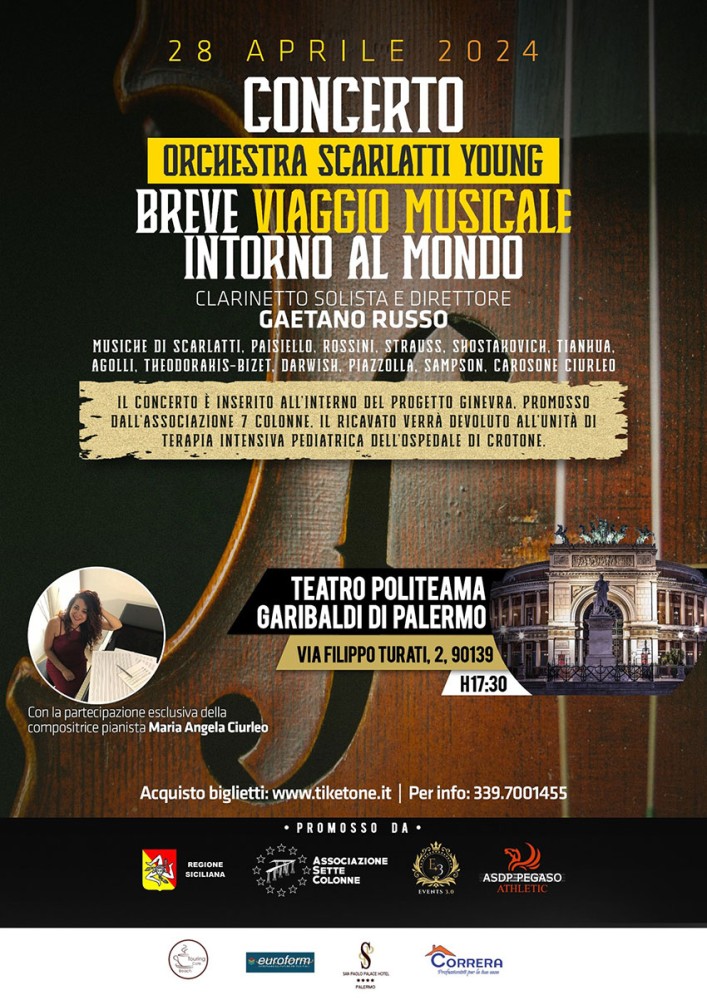 Un evento straordinario sta per prendere vita al Teatro Politeama Garibaldi di Palermo, dove l'Associazione 7Colonne, l’ASDP Pegaso e l’Eventes 3.0 srl presentano con orgoglio il concerto di beneficenza "Breve Viaggio Musicale Intorno al Mondo". Questo eccezionale evento musicale, che si terrà il 28 aprile alle 17:30, non solo delizierà il pubblico con un viaggio sonoro attraverso le epoche e i generi musicali, ma contribuirà anche a una nobile causa, supportando l’unità di terapia intensiva pediatrica dell'ospedale di Crotone per l’acquisto di macchinari in memoria della piccola Ginevra.