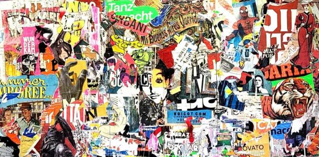 Michel Oz scruta le immagini e le parole che penetrano gli strati di carta strappati dalle pareti delle grandi metropoli, sovrapponendoli e accostandoli tra loro, in cui il mondo si mostra nella sua varia e costante trasformazione.