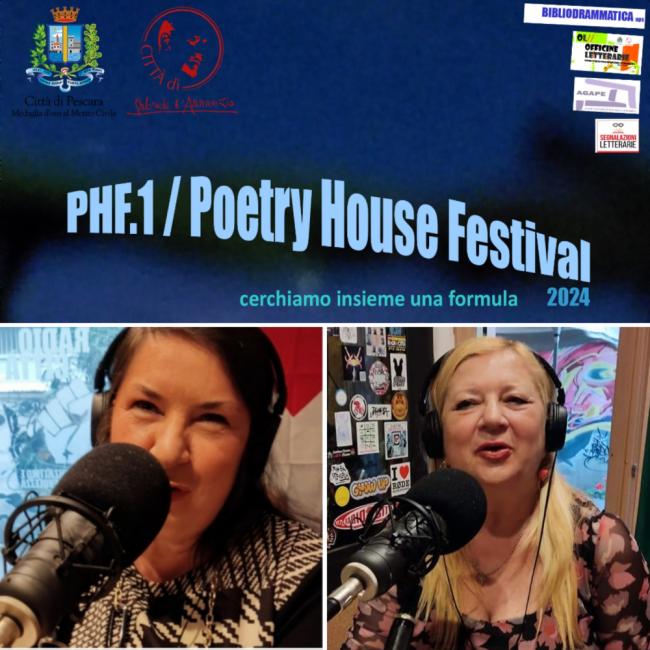 Venerdì 26 aprile 2024 (ore 20:40) in #pasquinellicasacultura, quarto appuntamento con il PHF.1/Poetry House Festival che andrà avanti fino a maggio e ospiterà nomi eccellenti della nuova scrittura abruzzese contemporanea. Ospiti della quarta serata Giulia Madonna (scrittrice e poetessa pluripremiata) e Sandra De Felice (poetessa pluripremiata). Il PHF.1 è patrocinato dal Comune di Pescara.